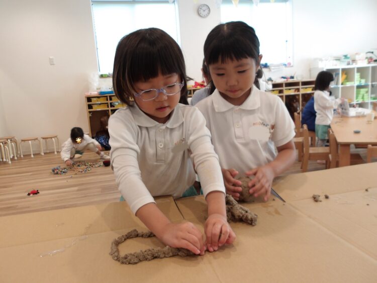 「早く乾いてほしいなあ〜」と呟いたり、みんなの作品を乾かしているシートを囲い、「これ私が作ったやつだよ〜」「◯◯ちゃんのはどれ?」と話し合ったりしていました。