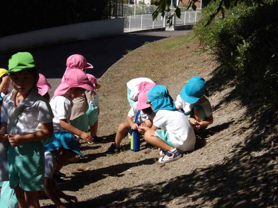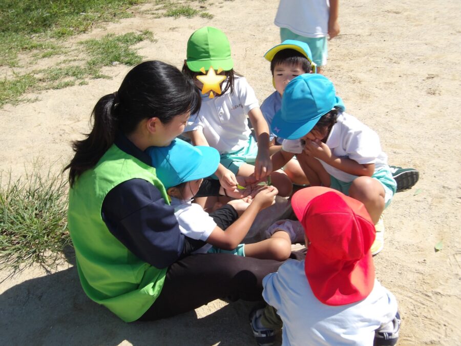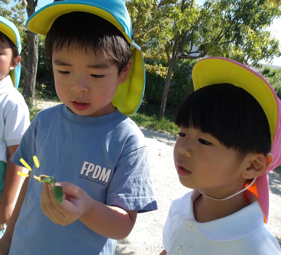 草むらで虫探しをしていた子どもたちは幼虫を見つけました。