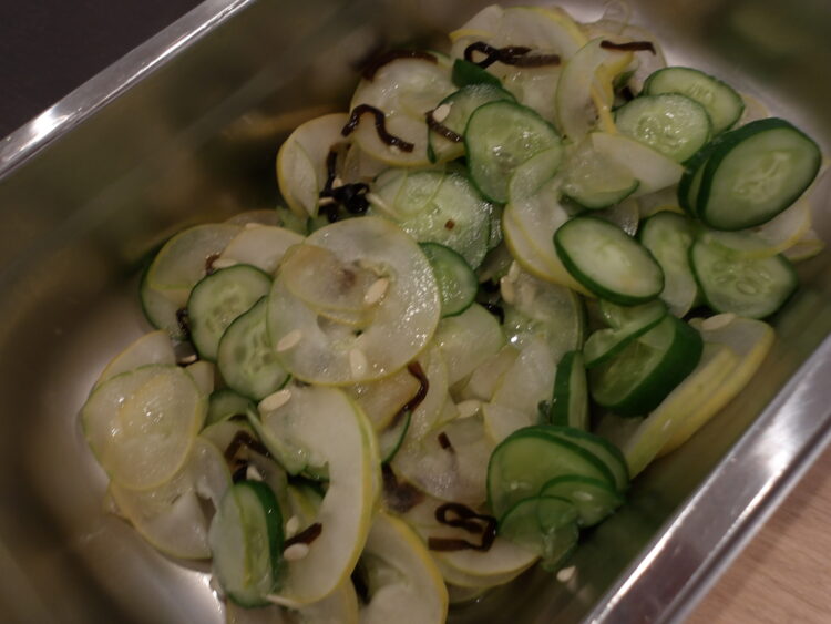黄色のきゅうりも食べられるとのことで、黄色と緑のきゅうりの食べ比べ。