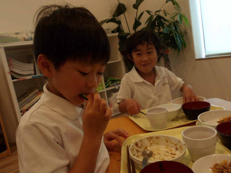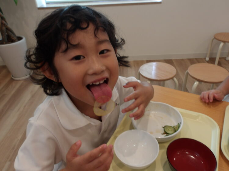 昨日、給食の調理さんに切ってもらうか自分たちで漬物を作るかを話し合ったところ、きゅうりそのものの味を楽しみたい子が多く、今回は調理さんに切ってもらい、少しだけ味付けをしていただきました。