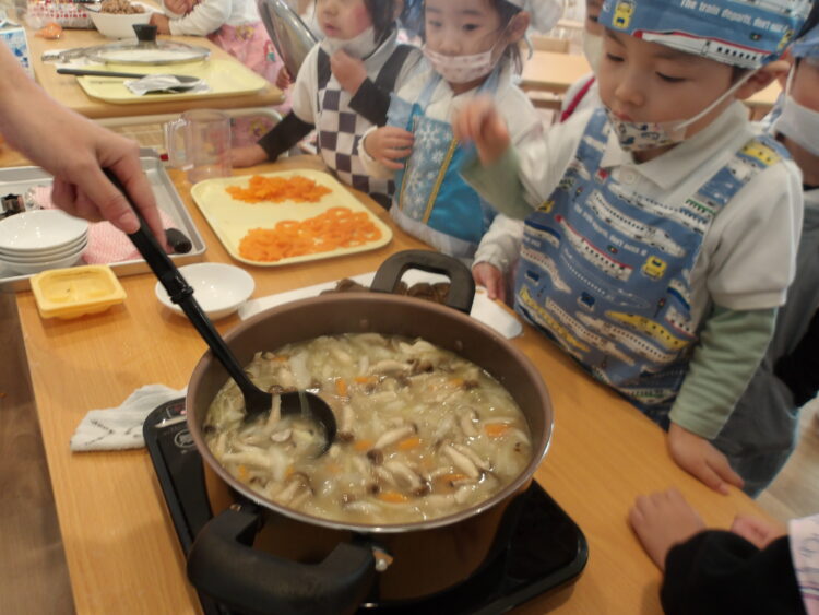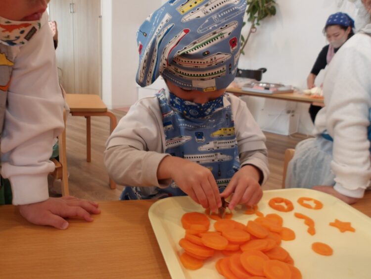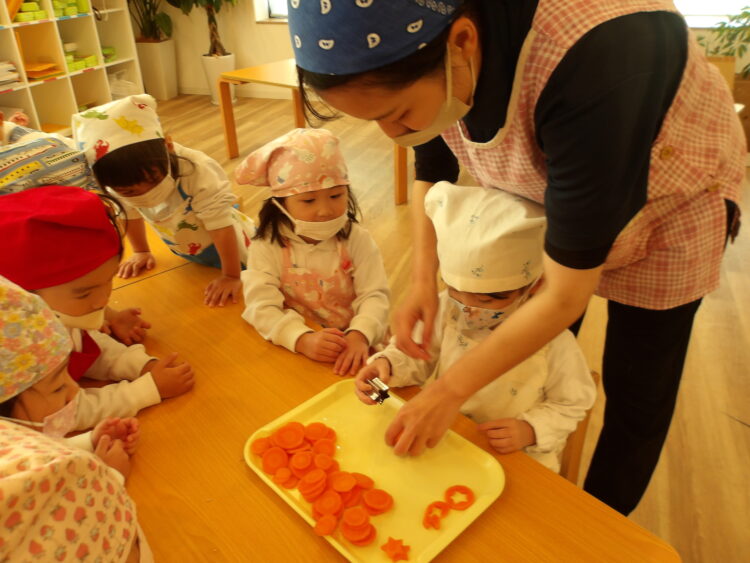 野菜の下ごしらえでは保育者から「順番こでやってね」「にんじんは3つずつやってね」と伝えていましたが、自分たちでも「次〇〇くんね」「〇〇ちゃんまだやってないから代わってあげて」と声をかけ合って進める姿が見られました。
