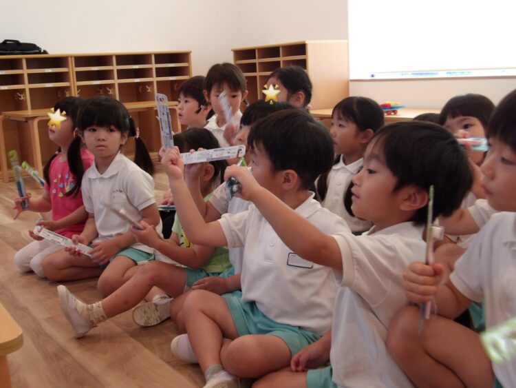にじ・たいよう組は2種類の歯ブラシの持ち方がすぐ分かり、得意げに実践していました。