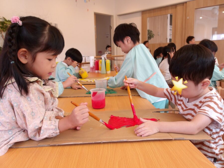 保育園のロゴの色塗りが終わったら、今度は大きい布に絵の具を広げていきます!