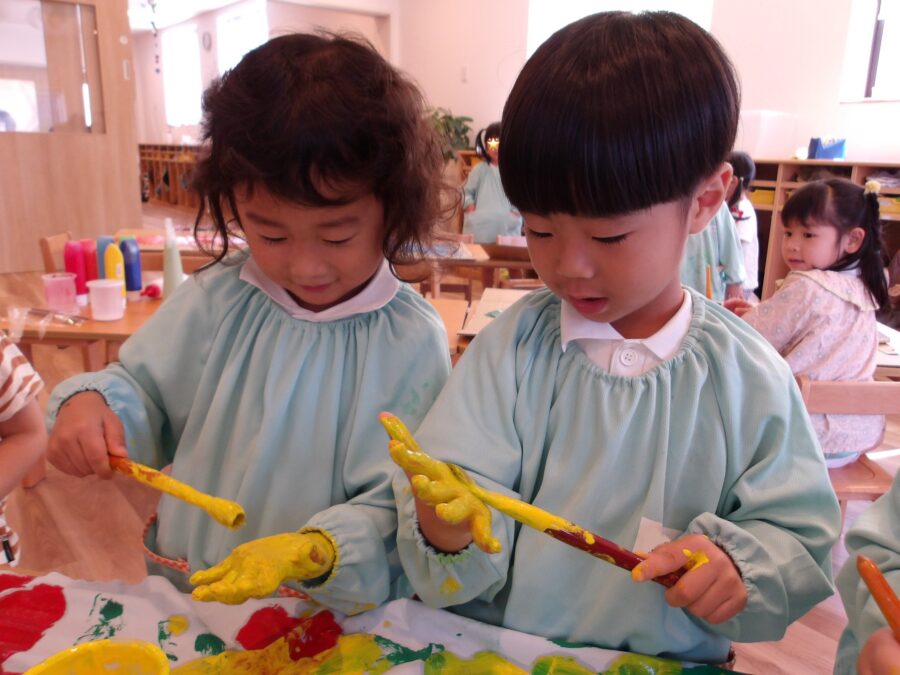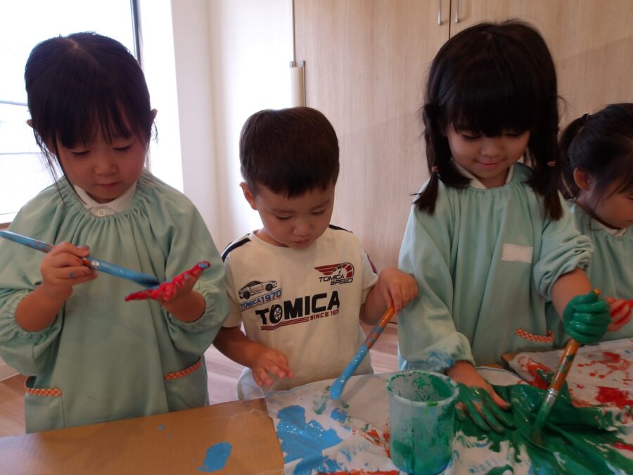 自分の手のひらにもベッタリと絵の具を塗って感触を楽しんだり、手形を押したりして楽しんでいました。