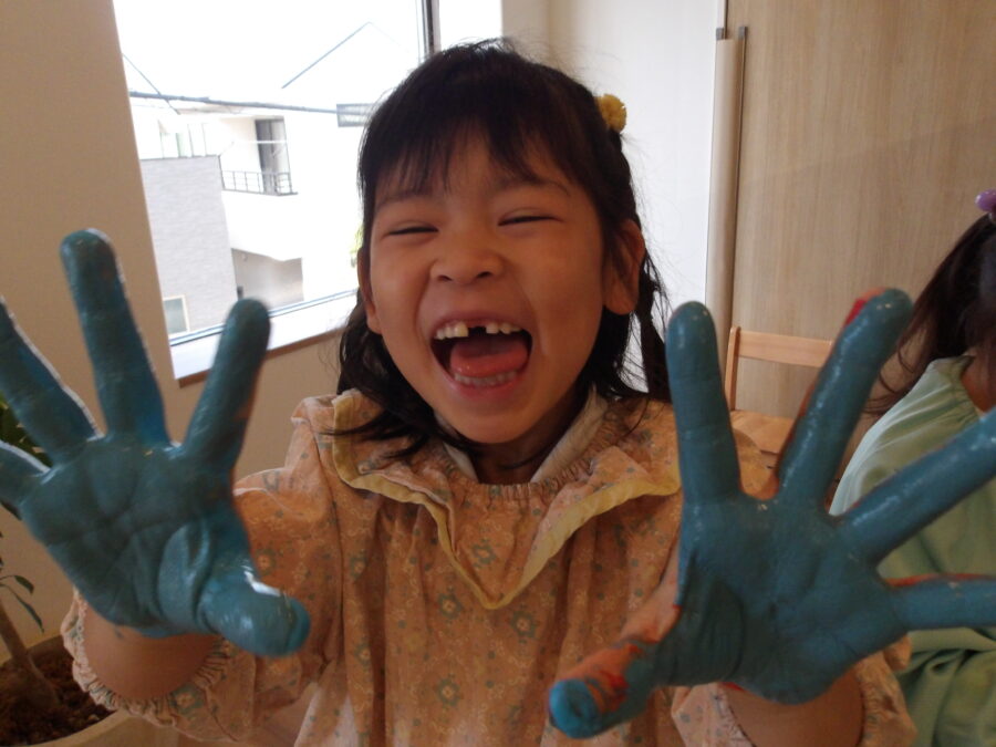 手のひらに絵の具を塗るたび色が変わっていき、「○○色になった〜!」と大笑いで見せてくれました。