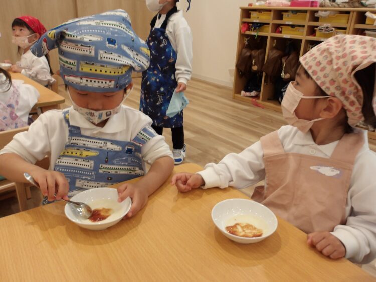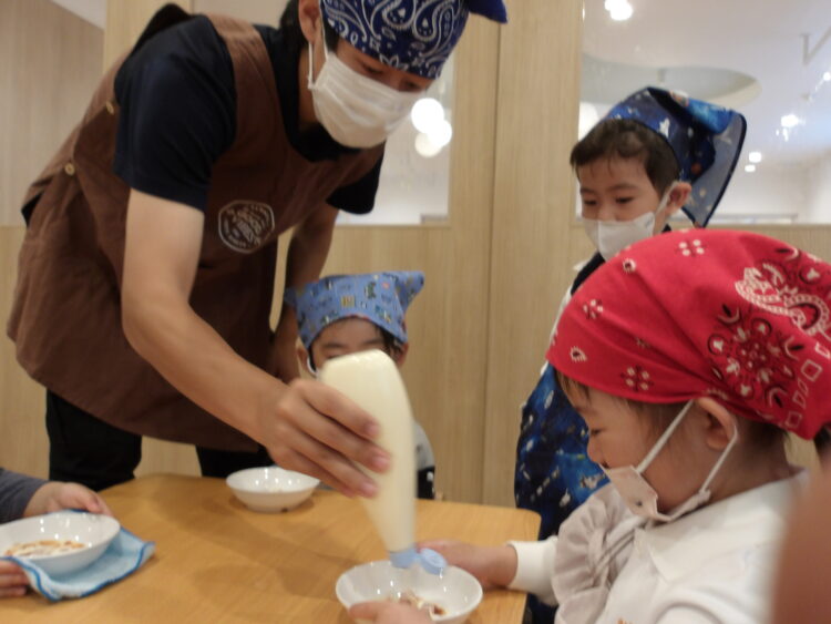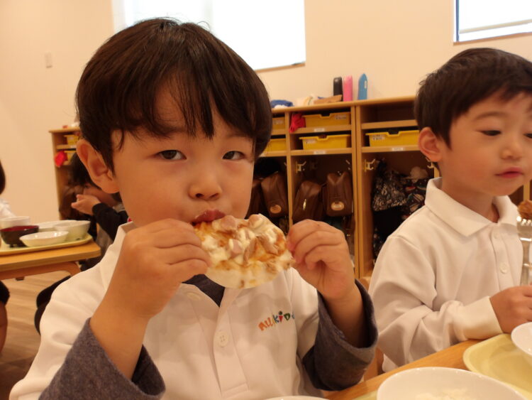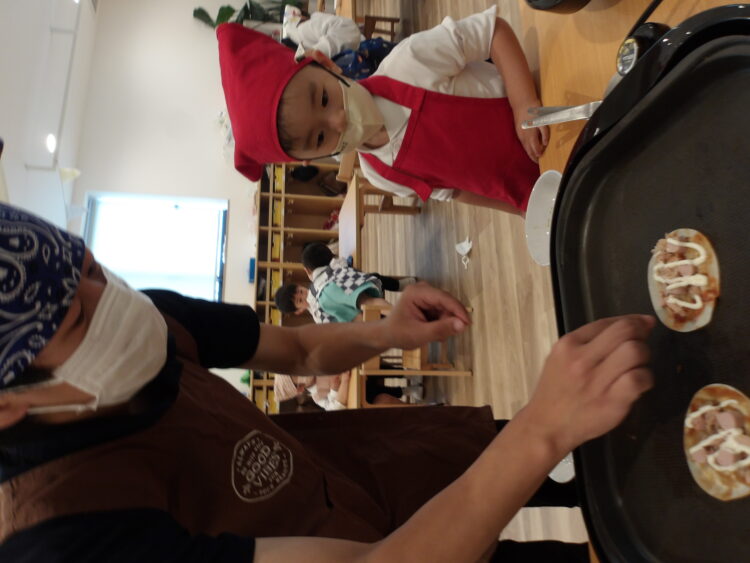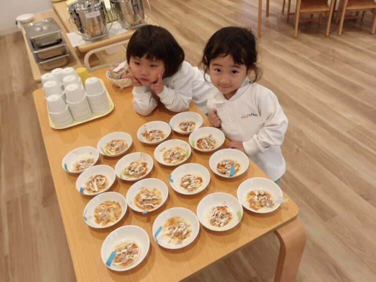上手にスプーンを使ってソースを伸ばしていました!次はトッピング! ソーセージとツナをトッピングしたよ!