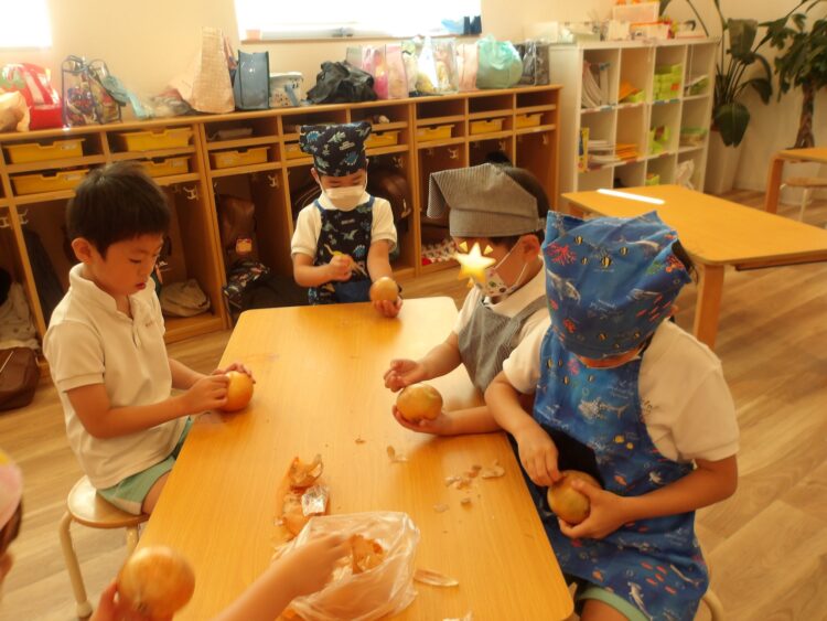 保育者が横で玉ねぎを切っていると、