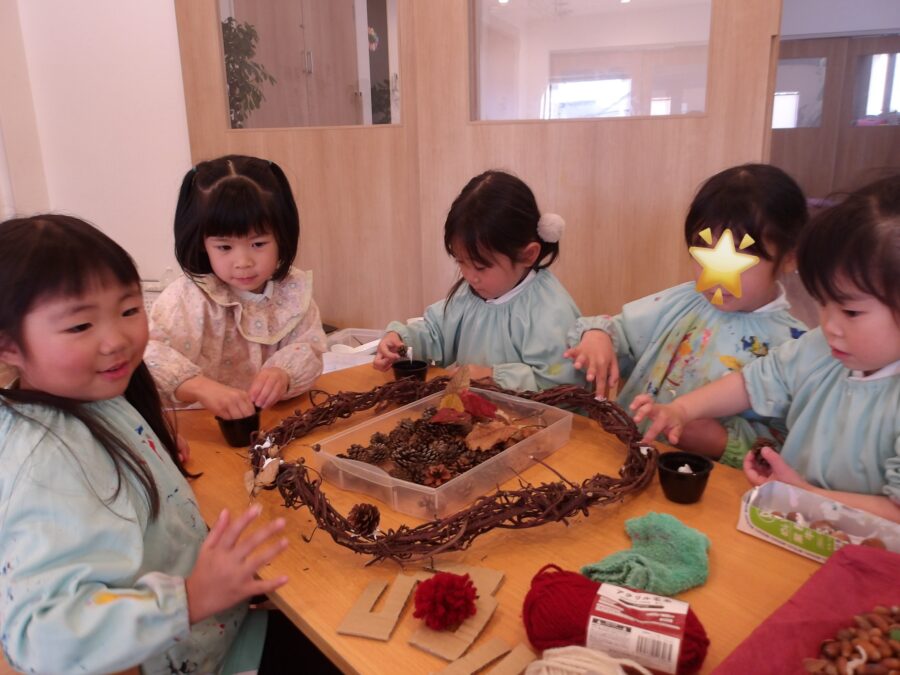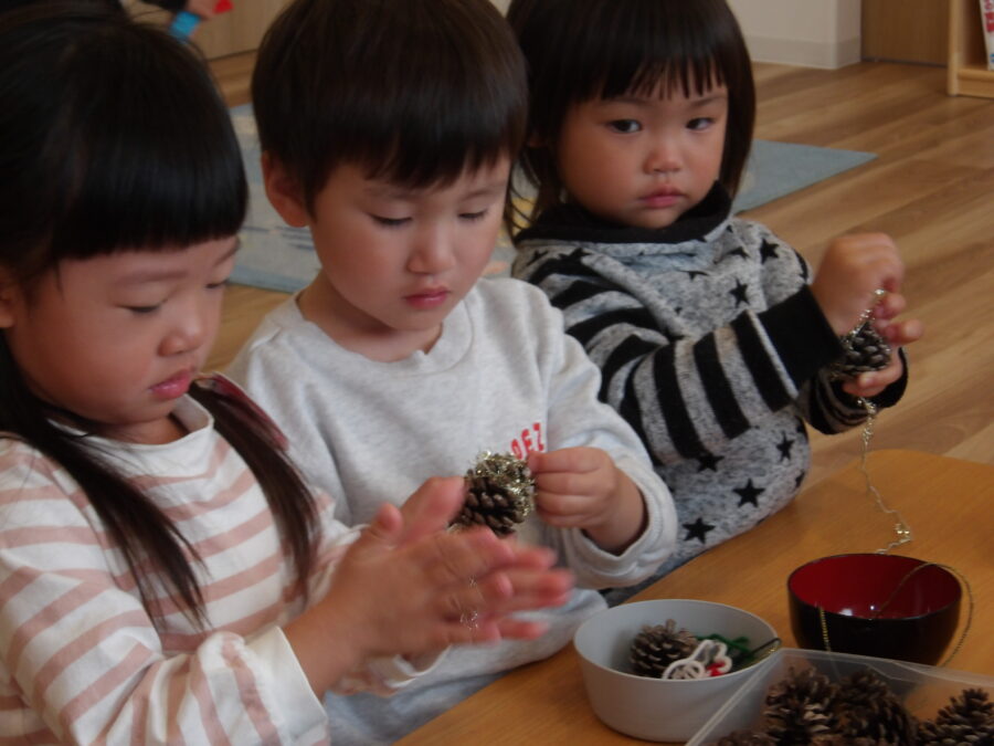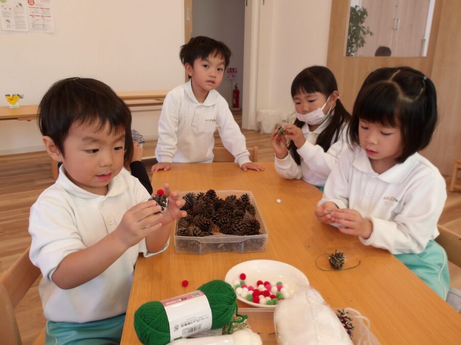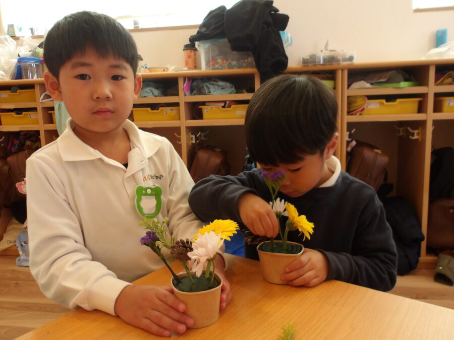 フラワーアートを終えた幼児クラスの子たちもオーナメントを作ったり、