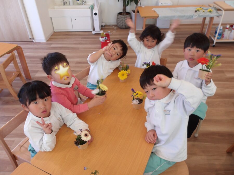 フラワーアートに何度か登場した慣れ親しんだお花を見て、「ガーベラ!」「リンドウ?」と知っている花の名前を呟いたり、「わ!このお花可愛い♩」と今回初めて見たお花(デルフィニウム)を近くで見たり匂いをかいだり。