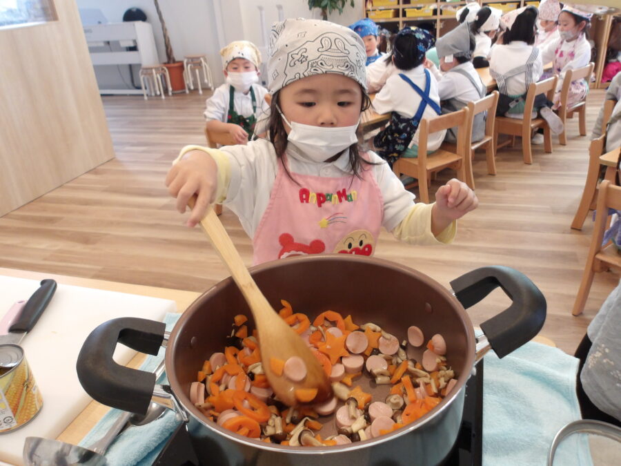 自分たちで準備した材料をお鍋に入れて炒めます。