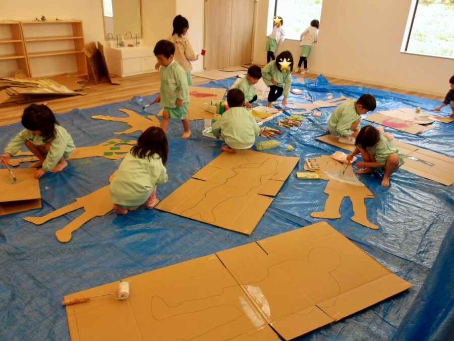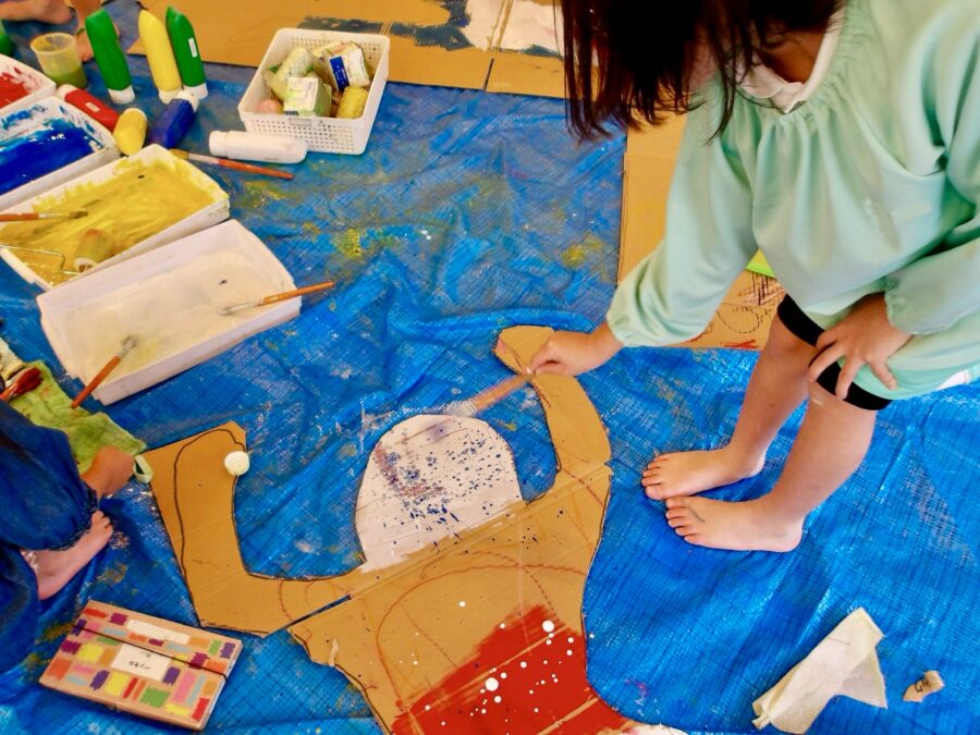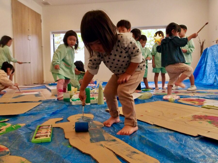 スポンジローラーで、まるでお掃除のようにコロコロと絵の具を塗り広げていく子どもたち。