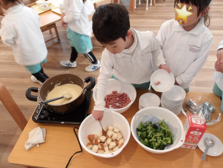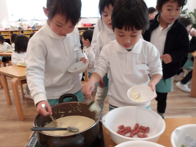 ウインナーを包丁で切ったり、牛乳を計量してチーズと混ぜたりと協力しながら進めていきました。