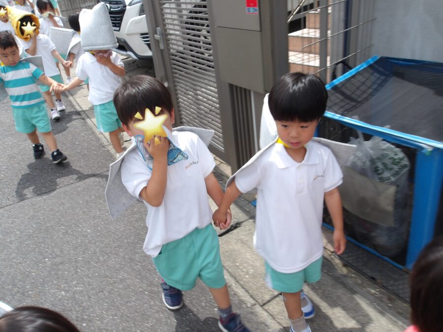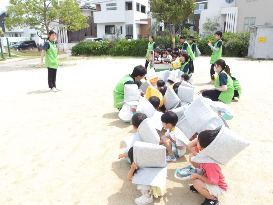 散歩とは違い、防災頭巾を被り、口元を手やハンカチで覆いながらという慣れない格好でしたが、しっかりと歩いて避難することができました。