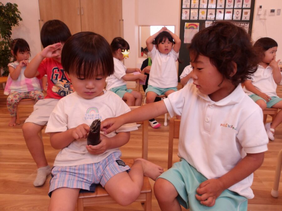 チョウを捕まえようとする子どもたちに「卵を産みに来たのかな」と保育者が話すと、「(葉っぱにいる)幼虫を見に来たんじゃない。あの蝶々はお母さんなのかも!」といい、捕まえるのをやめてじっと目で追いかけていました。
