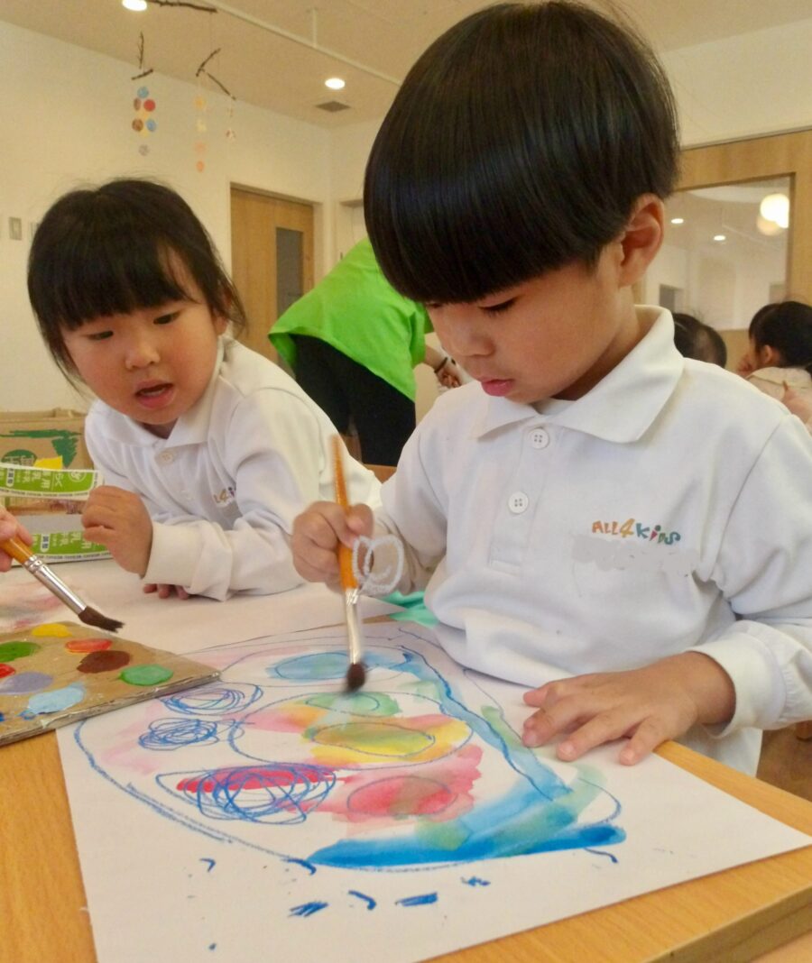 手や服を汚しにくく、お手軽に水彩画が楽しめるので、夢中で画用紙に向かう子どもたち。