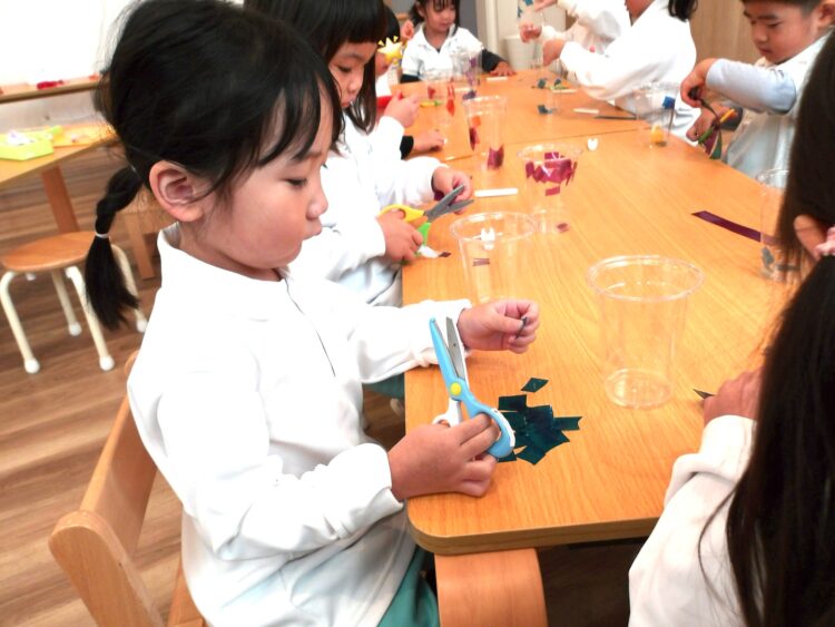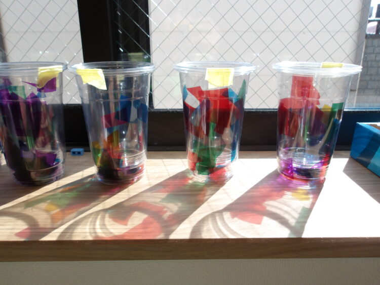 静電気でカップの側面や手にくっついてしまうのも面白かったようで、切ったセロハンを並べるようにカップの内側に貼り付ける子もいましたよ。