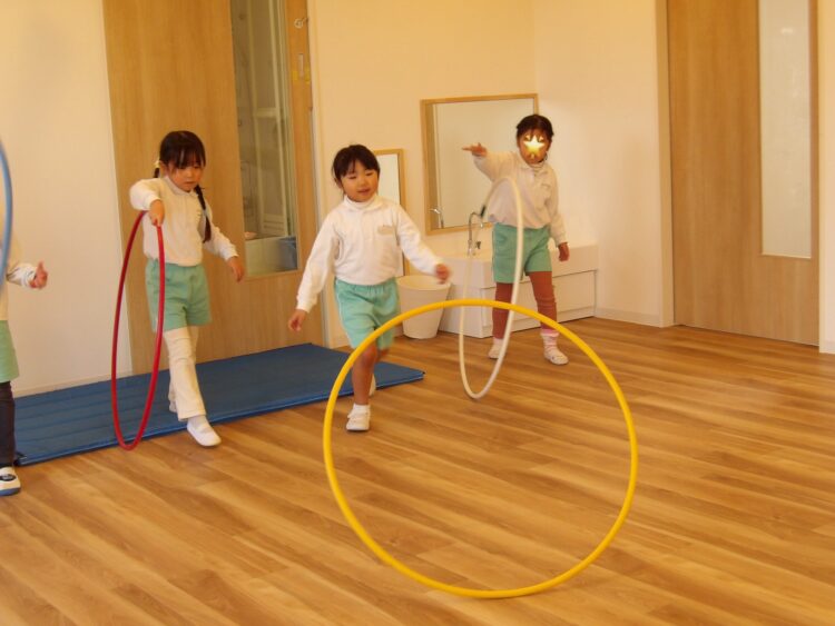 たいよう組は手首を返し、投げたフラフープが自分のところへ回って戻ってくるように回すことにも挑戦。