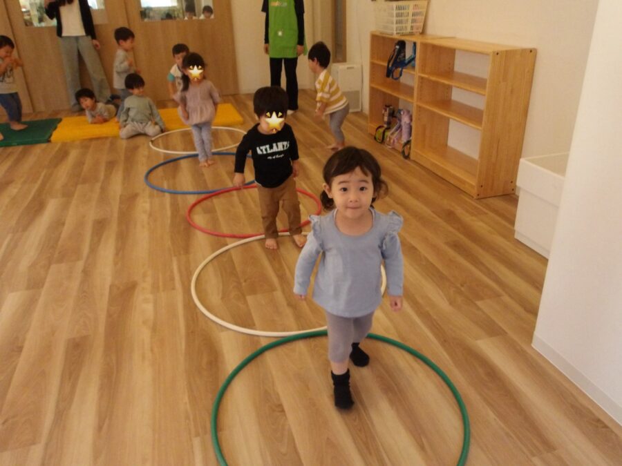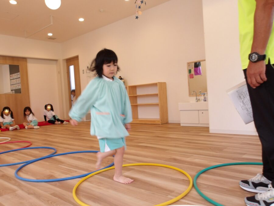 またフラフープまで走って行き、円の中でストップする運動もしました。
