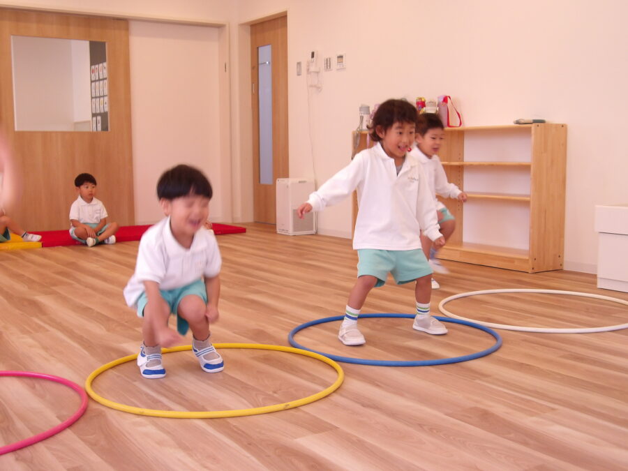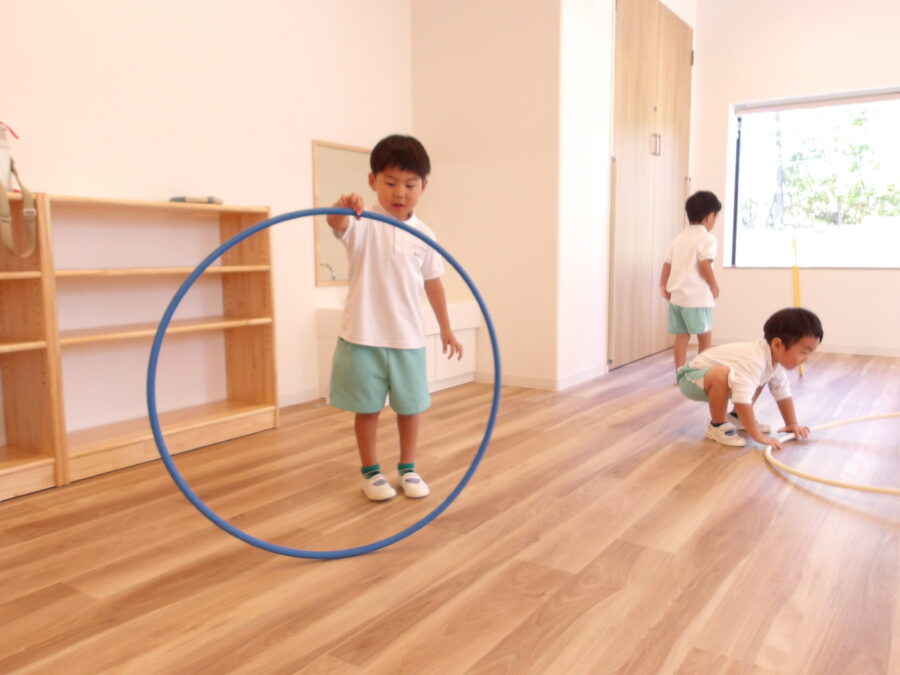フラフープを見せて、「これ何か知ってる?」と講師が尋ねると、「まる!」「ハンドル!」「タイヤ!」と沢山の答えが出てきた、うさぎ・そら組の子どもたちです。