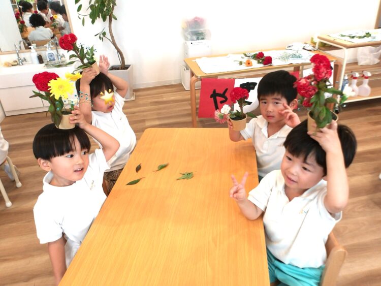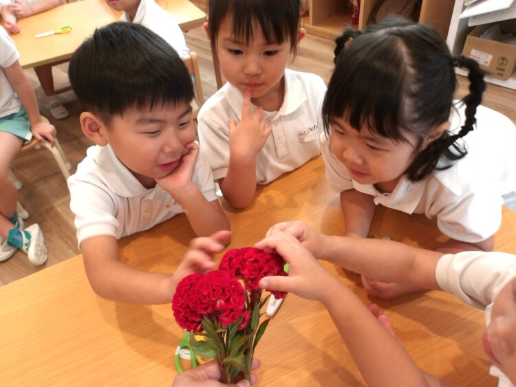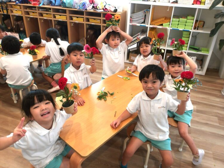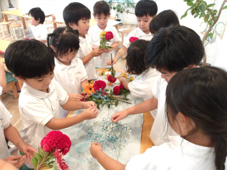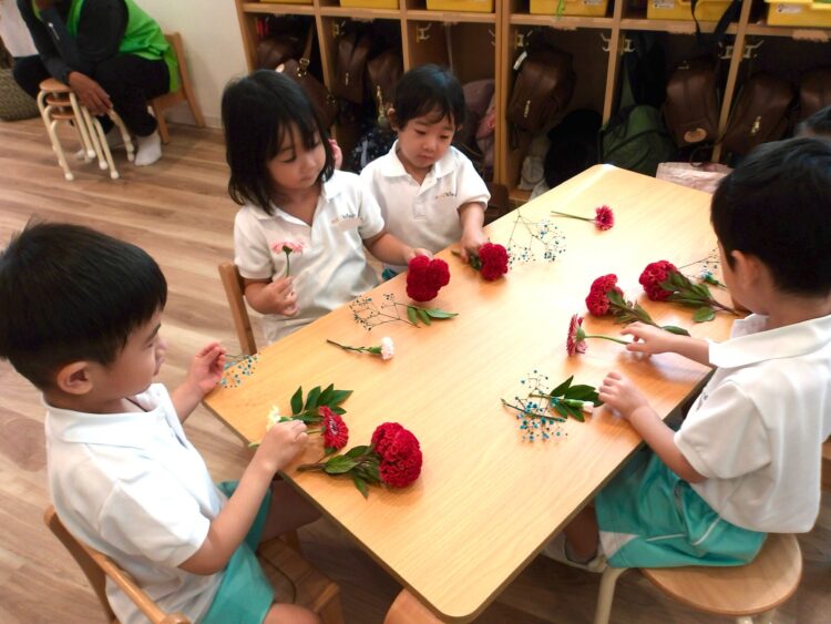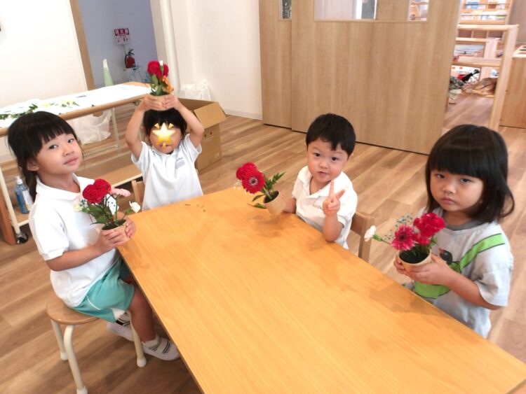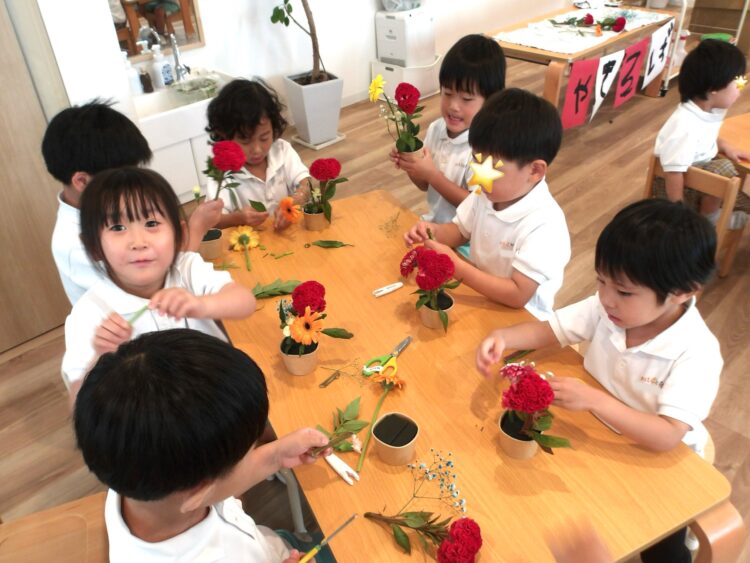 いつもお花の茎は子どもたちが挿しやすいように保育者が事前にカットして調整していたのですが、今日はにじ・たいよう組はケイトウとガーベラの茎の長さを自分たちで調整しました。