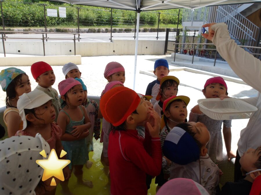 プール遊びもだいぶ慣れてきたようで、お壁ぴったんでお話を聞く子どもたち☺️