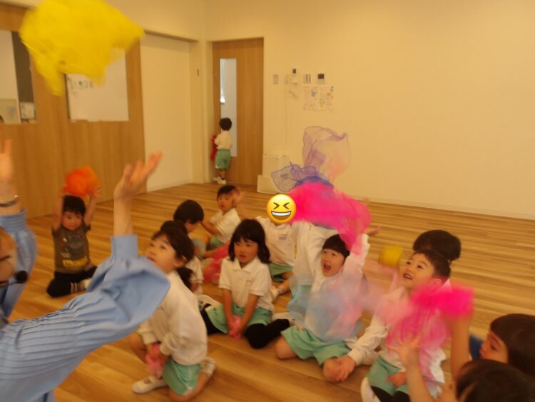 シフォン布では布をお花に見立てピアノのリズムに合わせながら揺らしたり、飛ばしたりと楽しんでいました🌼