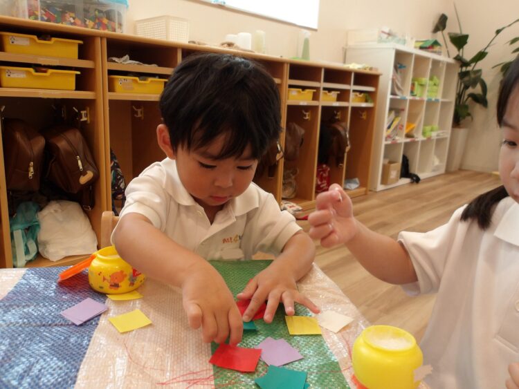 「のりはほんの少しだけ。アリさんくらいを付けてね」とはじめにのりの使い方を伝えると、指の先にちょんと付くくらいを意識して使うことができました。