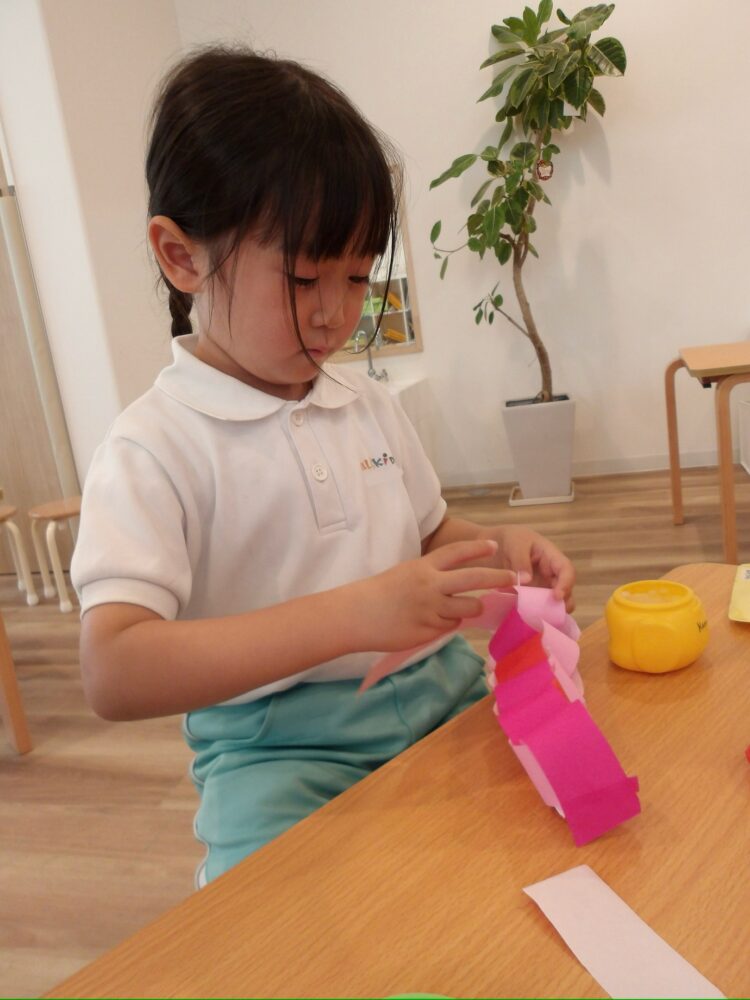 好きな色の折り紙を選び、好きな順番で繋げていきます。