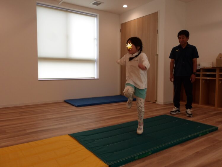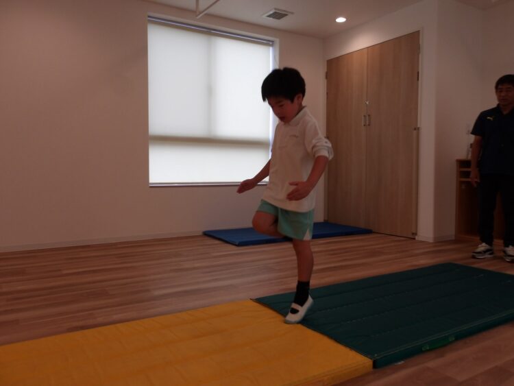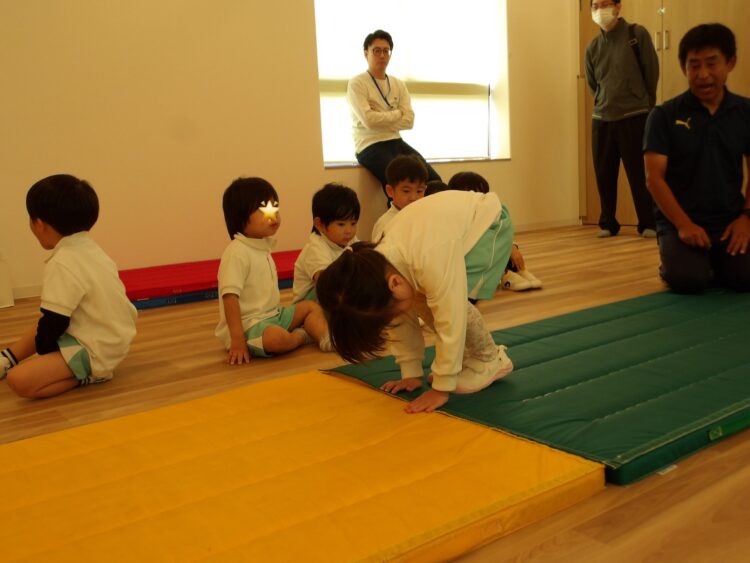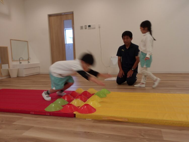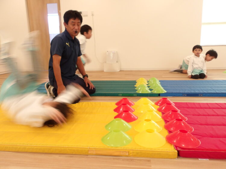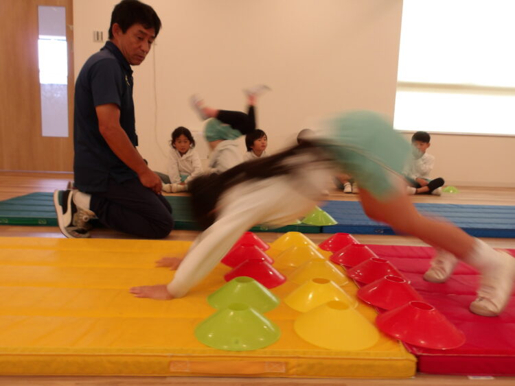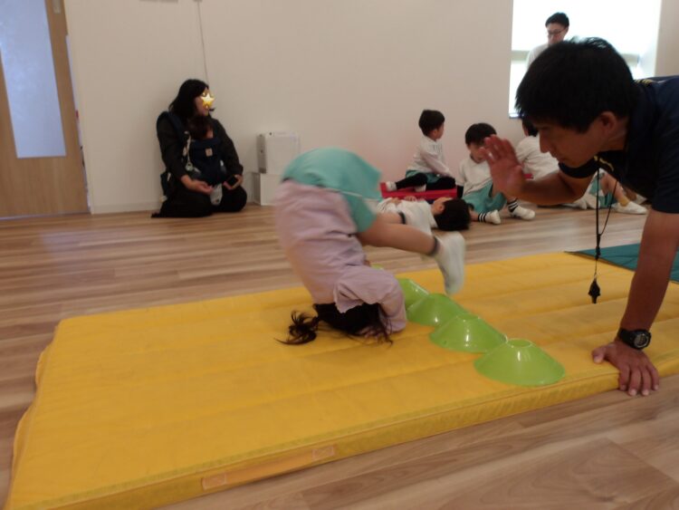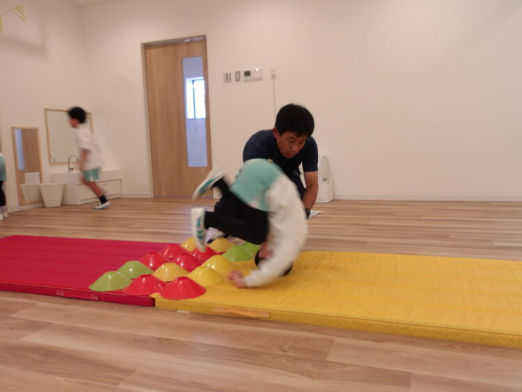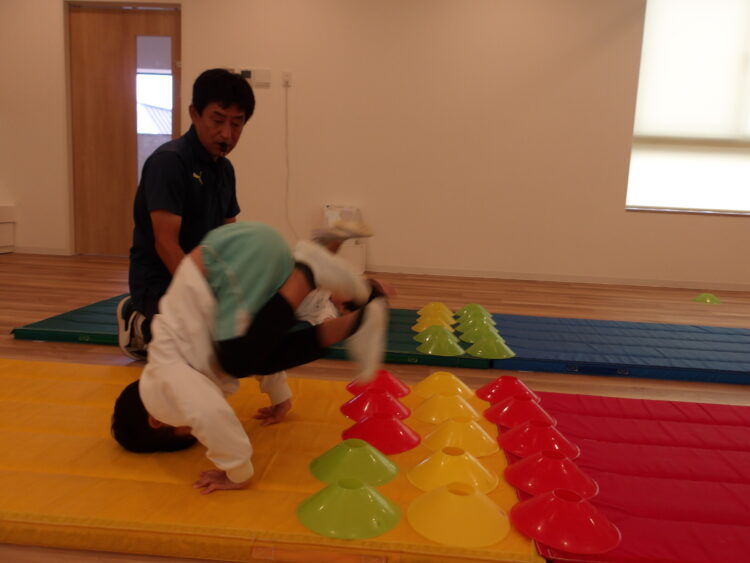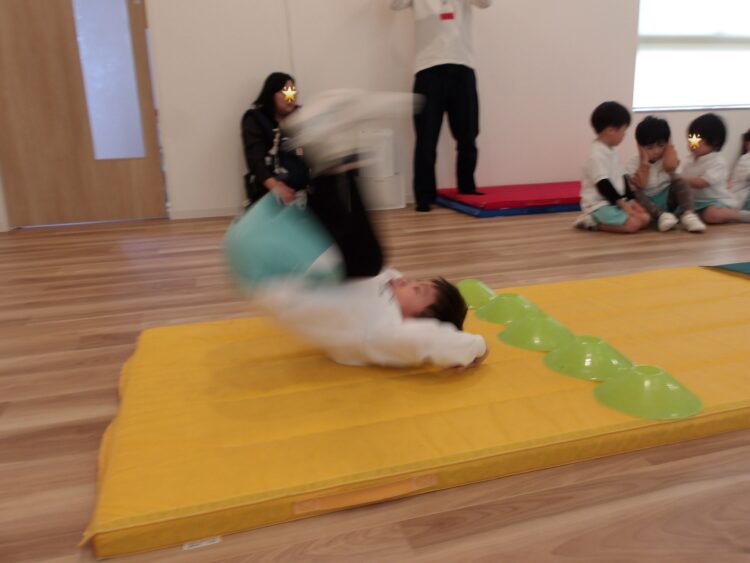 いつもは足の近くに手をつくように指導されているので、マーカーがあることで手をつく位置が遠く、はじめは少し難しそうでしたが、少しずつコツを掴み成功する姿が見られました。