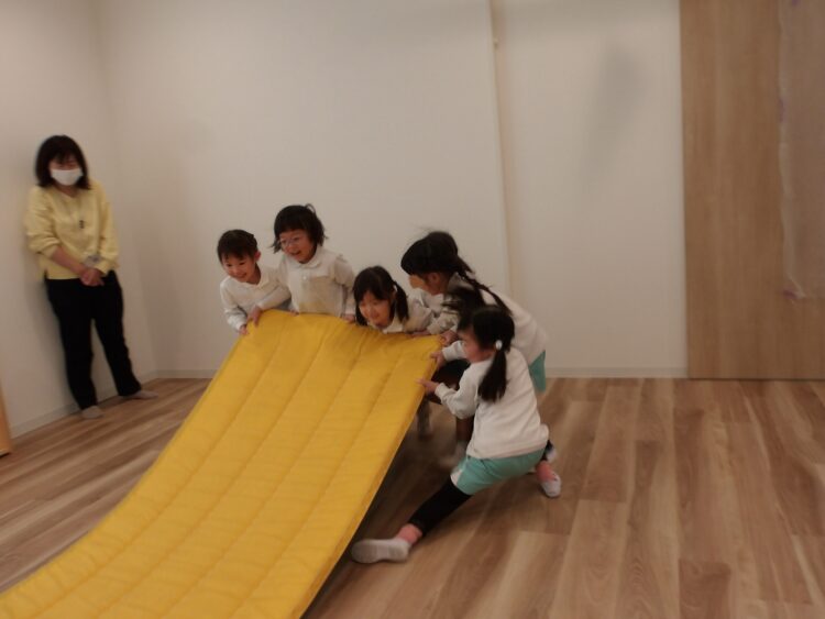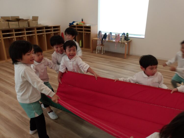重たいマットを友だちと協力して引っ張っていました。