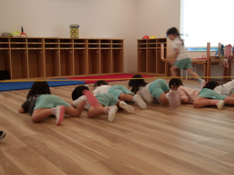 ロープくぐりでは、床にお腹を付けて、ロープに触れないようにくぐることができました。