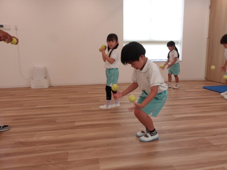 どっちもできるようになったら、今度は両手にボールを持って同時にバウンドキャッチ!