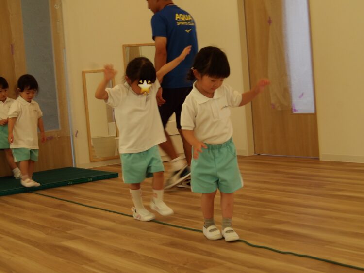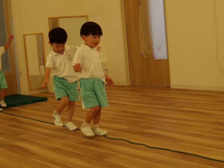 にじ組もロープ渡りのほかに、左右に跳びながら進んだり、片足ジャンプで進んだりすることに挑戦しました。