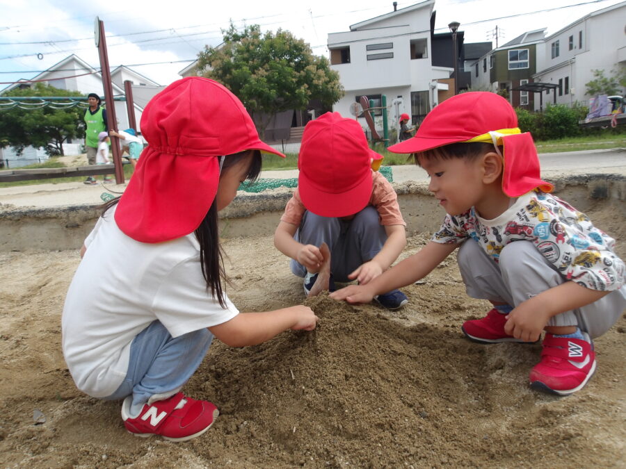うさぎ組は砂場にできていたお山が気になり、葉っぱを挿したり、「階段作ろ〜」と手で形を整えたりしていました。