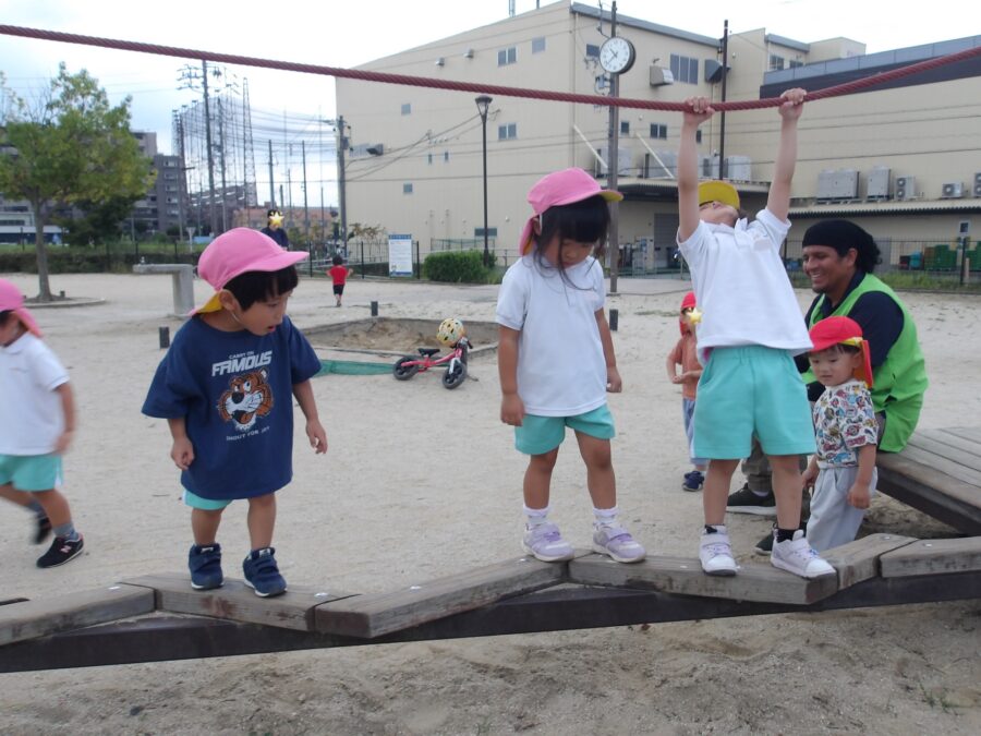 ゆらゆら橋を渡ったり、鉄棒にぶら下がったり、友だちと交代でブランコに揺られたり体を動かしてあそぶことを楽しんでいました。