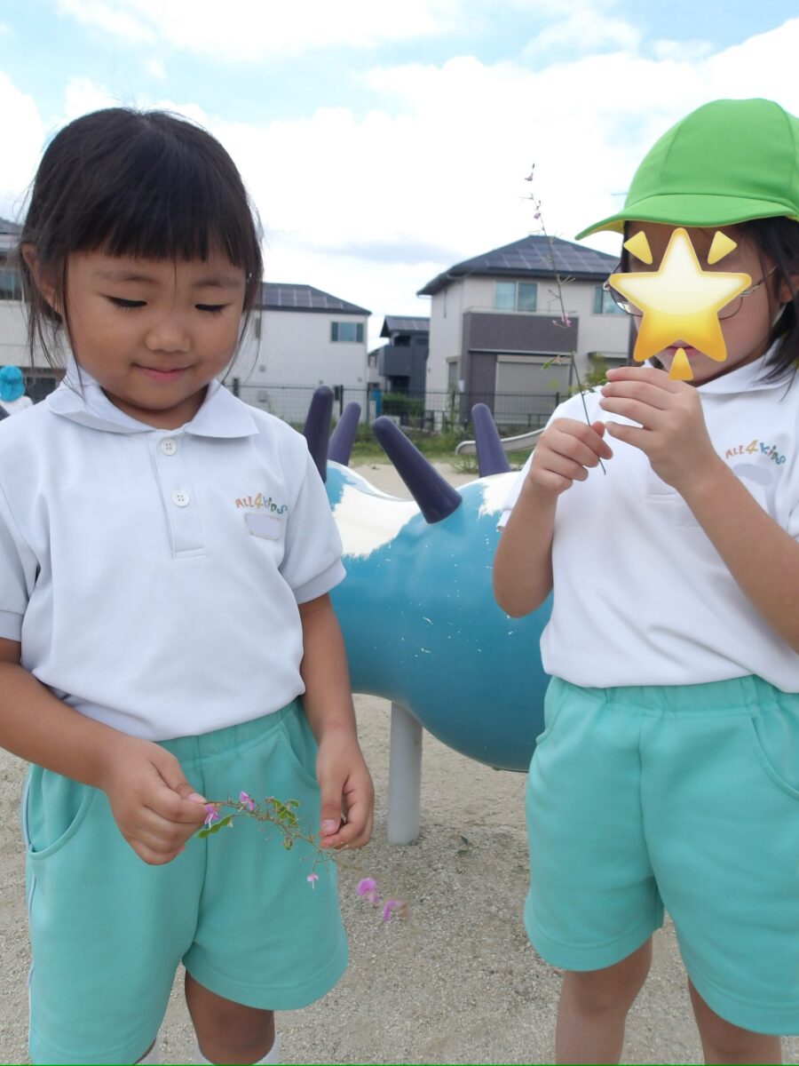 「くっつき虫だね♩」と保育者が小さな葉っぱを服につけて見せると、「これくっつくの?!虫?!」とびっくり😳