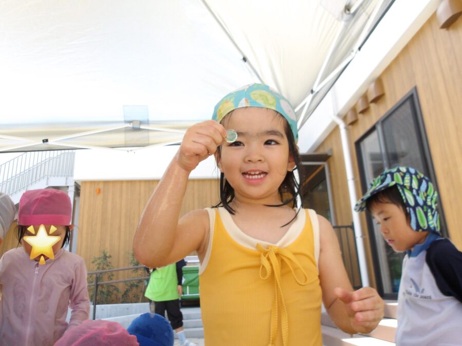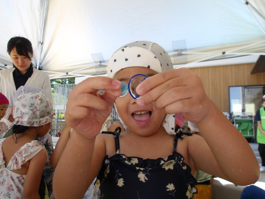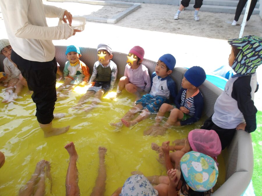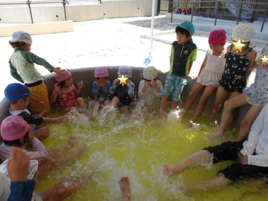 あるお友だちの姿から外を向いてジャンプすれば顔に水がかからないことに気付き、みんなでジャンプジャンプ!