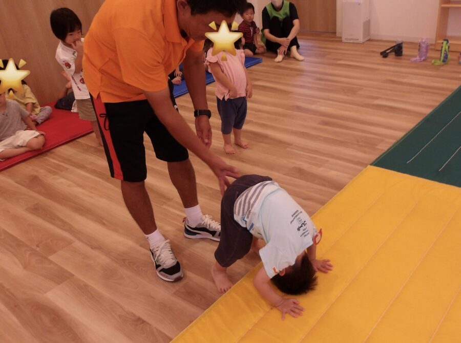 手をつく位置は、足の近く…先生の言葉を意識しながら、上手にクルッと回ることができましたよ!