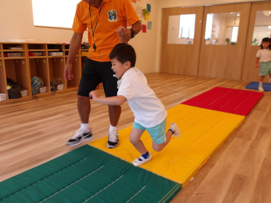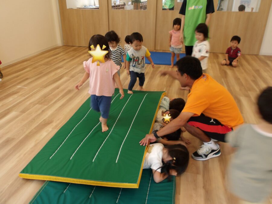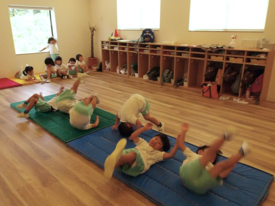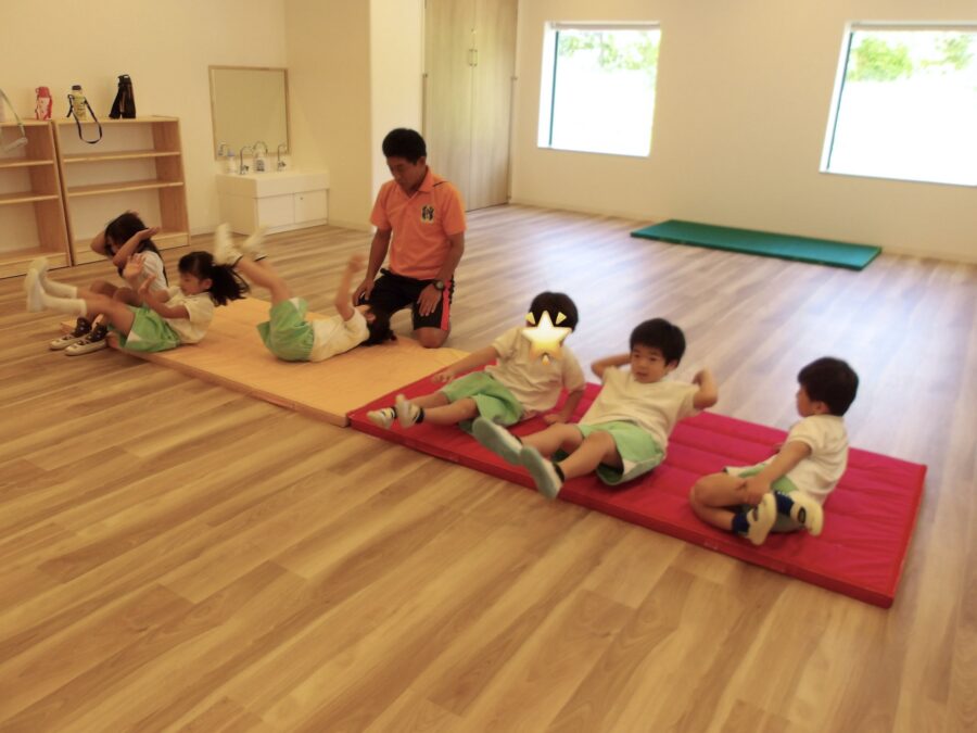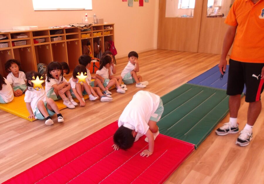 連続前転に挑戦したそら組のみんなは、マットから外れず、真っ直ぐ3〜5回の前転をすることができましたよ!
