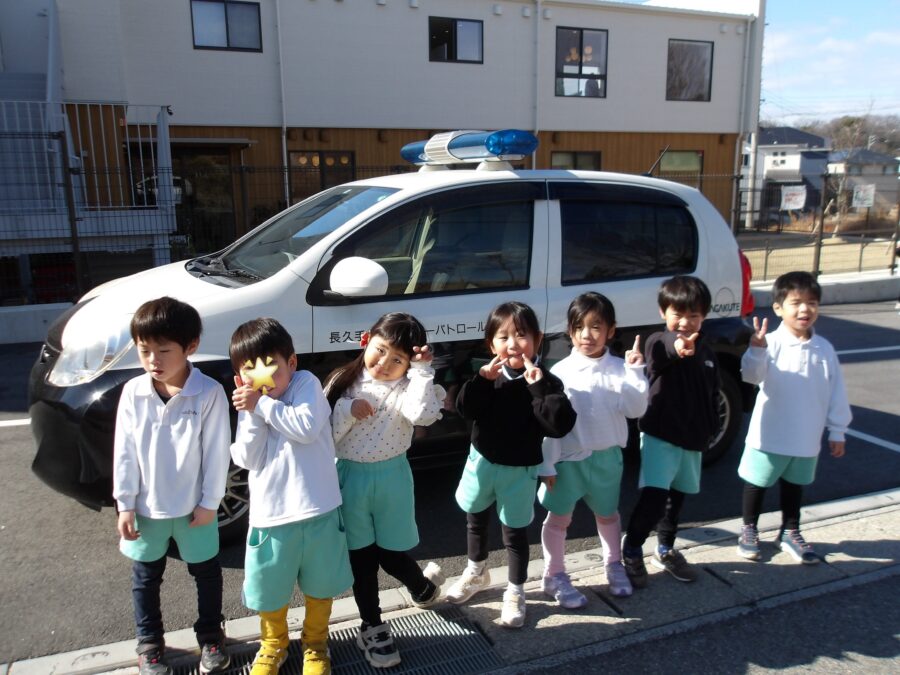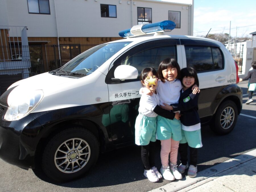 教室のあとは、青色ランプのパトカーと一緒に記念撮影。