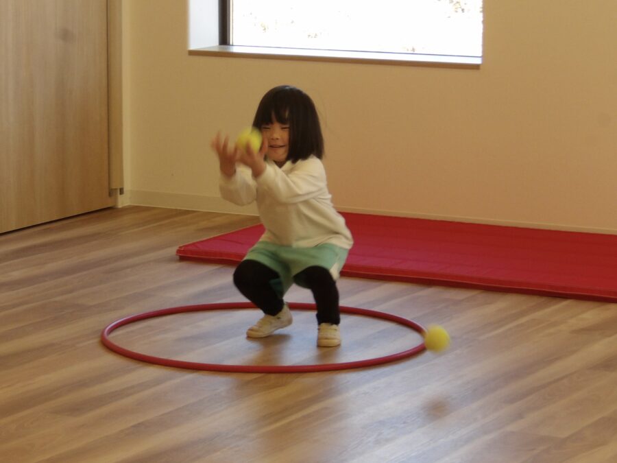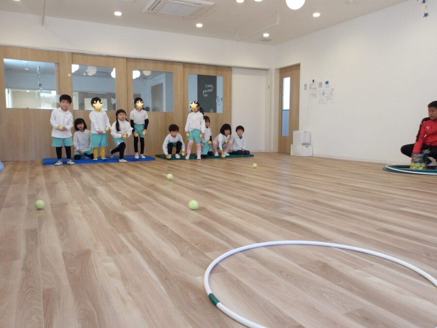 体操教室ではテニスボールを使ってキャッチしたり、転がしたりしてあそびました。ボールのバウンドや、重さをうまくコントロールしてボールを扱う姿が見られましたよ。