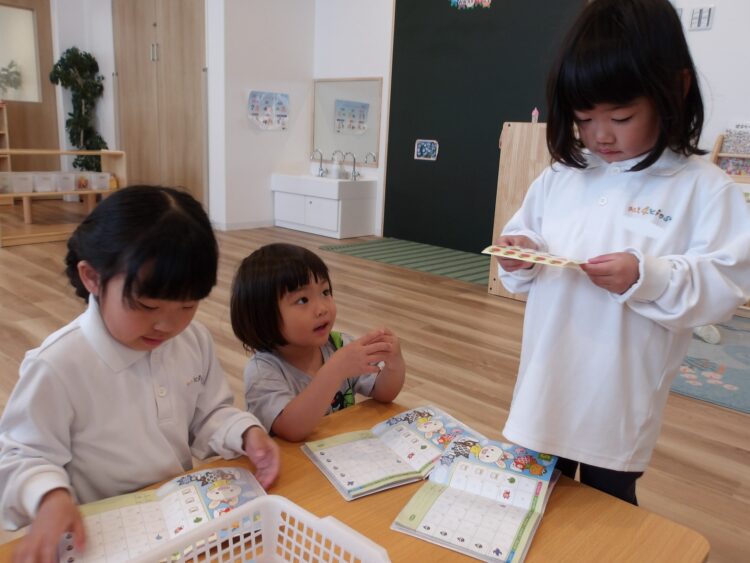 しゅっせきぶっくとにらめっこして日にちの確認をする子どもたちです。