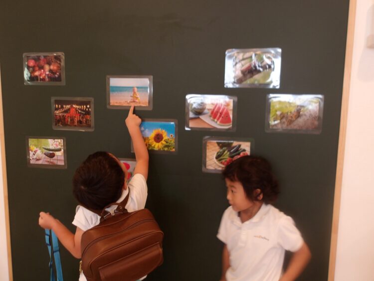 写真が貼りかわっていることに気づき、お友だちとのお話しを楽しんでいました。