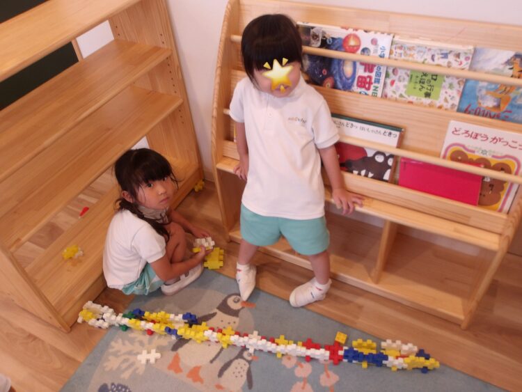 大きな机にたくさんの料理を並べてごはん会を開いたり、その隣ではおもちゃのカゴを並べてお店屋さんになっていたりと、それぞれのあそびとあそびが交じり合い、あそびが広がっていく様子が見られました。