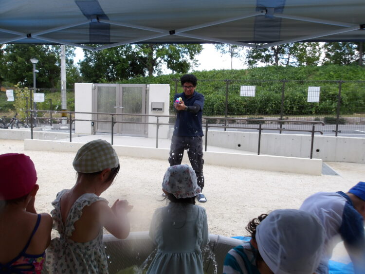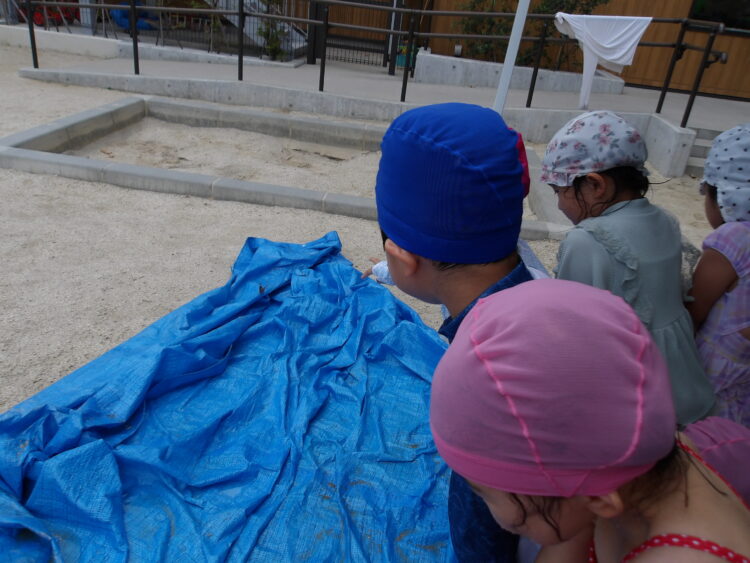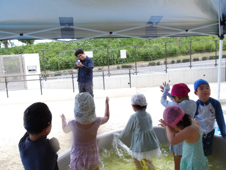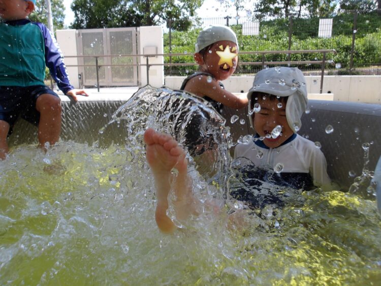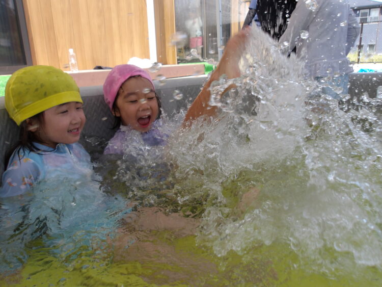 お友だちと水をかけ合う場面では、向かい合ってかけ合うだけでなく、前にいる子、前にいる子と順々に背中にかけ合いっこする姿があり微笑ましかったです。