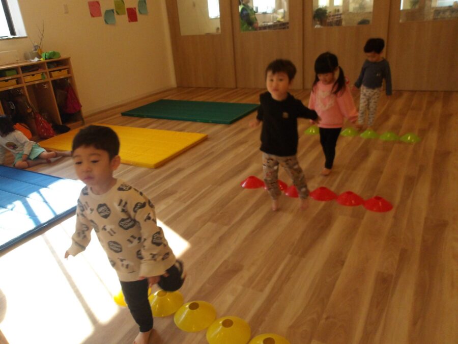 うさぎ組さんはマットとマットの間を跳んだり、コーンを踏まないように跳び越えたりしましたよ![]()