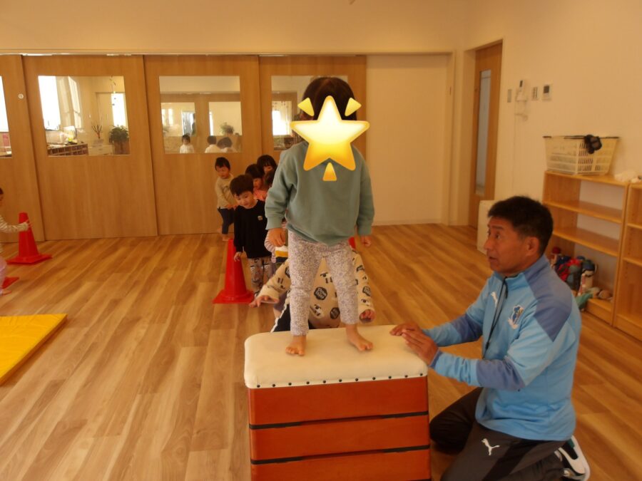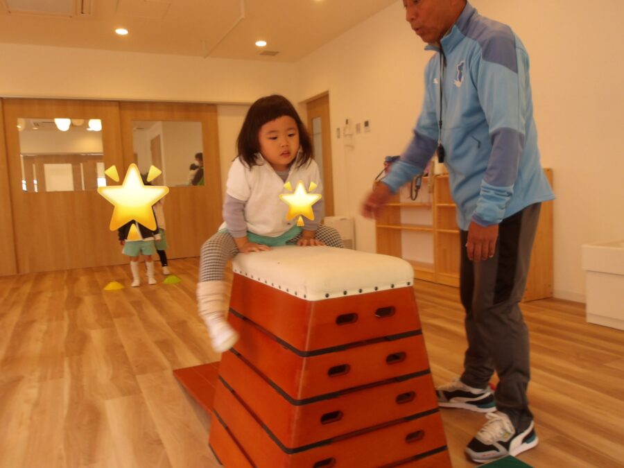 体が温まったあとは跳び箱の上から大ジャンプ!をしたり、跨ぎながら前に進んでみたり♪