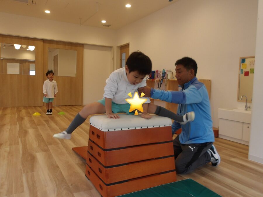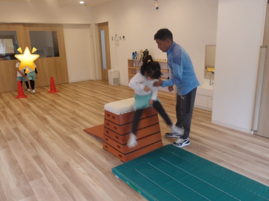 跳び箱にも挑戦!まずは両足で思い切り飛んで、跳び箱の上に乗るところから練習しました