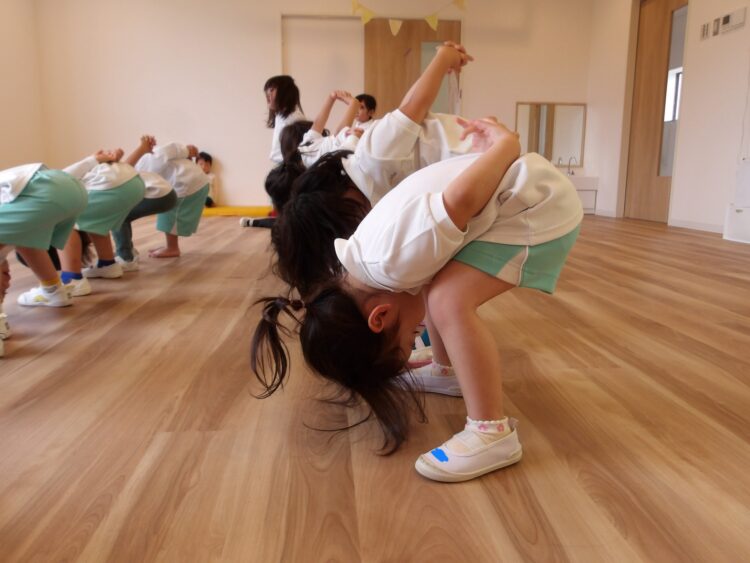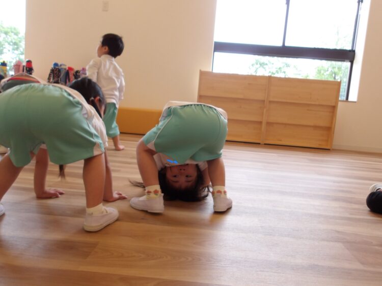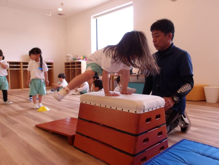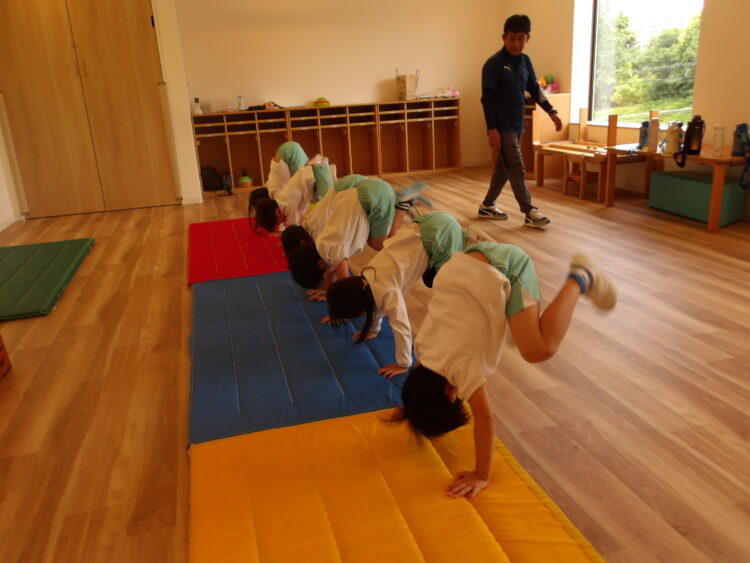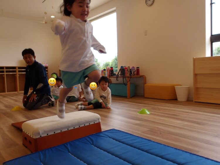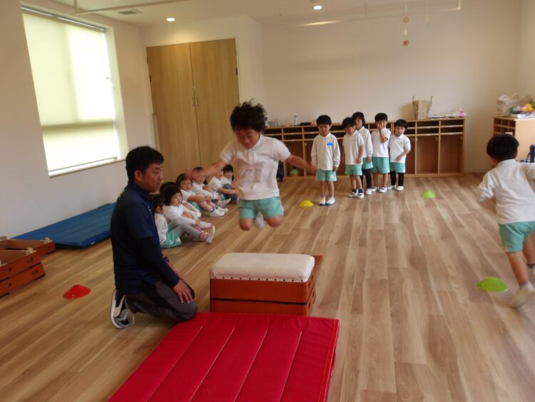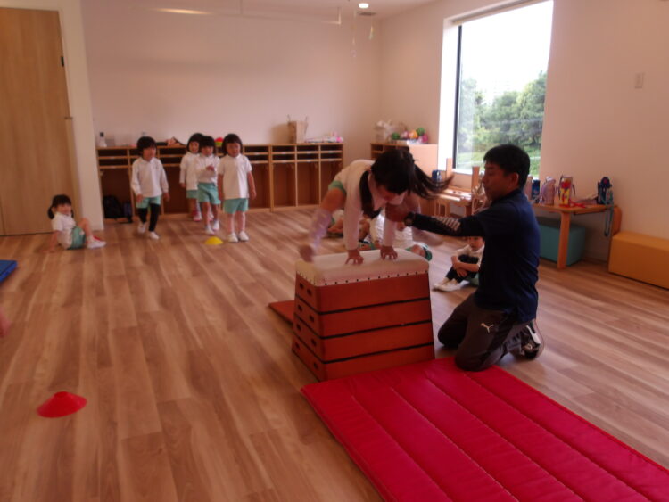 たいよう組さんは跳び箱の前にかえる飛びをしました! 手に力を入れないと顔から落っこちちゃうぞー!