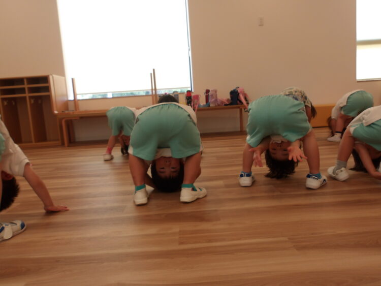 手足をぶらぶらしっかりと動かして!次は足の間から後ろが見えるかな?こんな面白い挑戦もしたね!